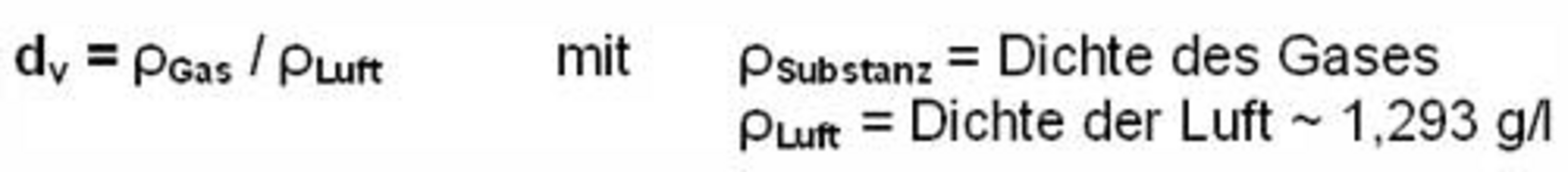 Dämpfe brennbarer Flüssigkeiten haben ein Dichteverhältnis dV > 1, sie sind somit schwerer als Luft. Tiefkalte und hygroskopische Gase wie z.B. Ammoniak bilden mit der Luftfeuchte Nebel, welcher schwerer als Luft ist.
